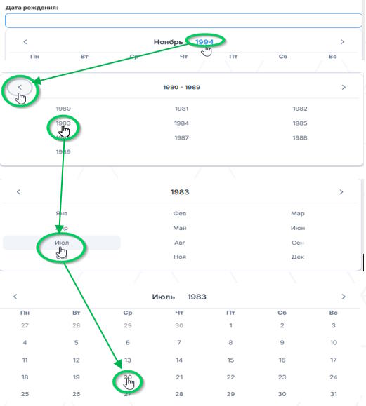 Внесение даты рождения возможно не только непосредственным набором даты, но и пошаговым выбором (года-месяца-даты)