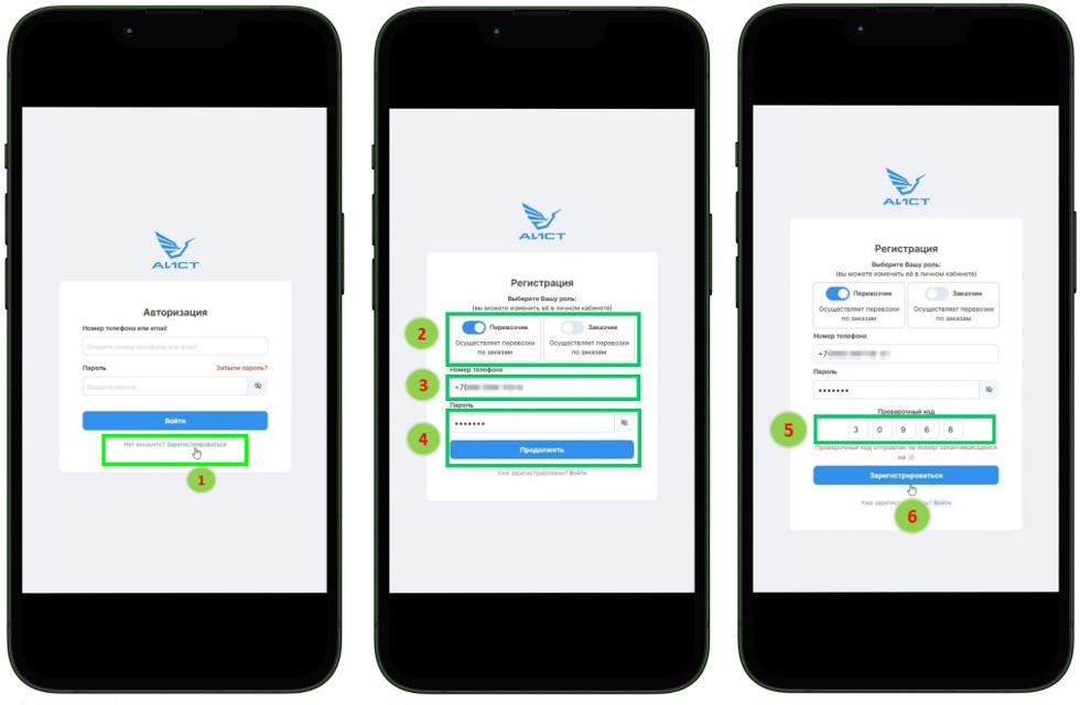 2. Выберите роль в системе («Перевозчик» для осуществления перевозок по заявкам)