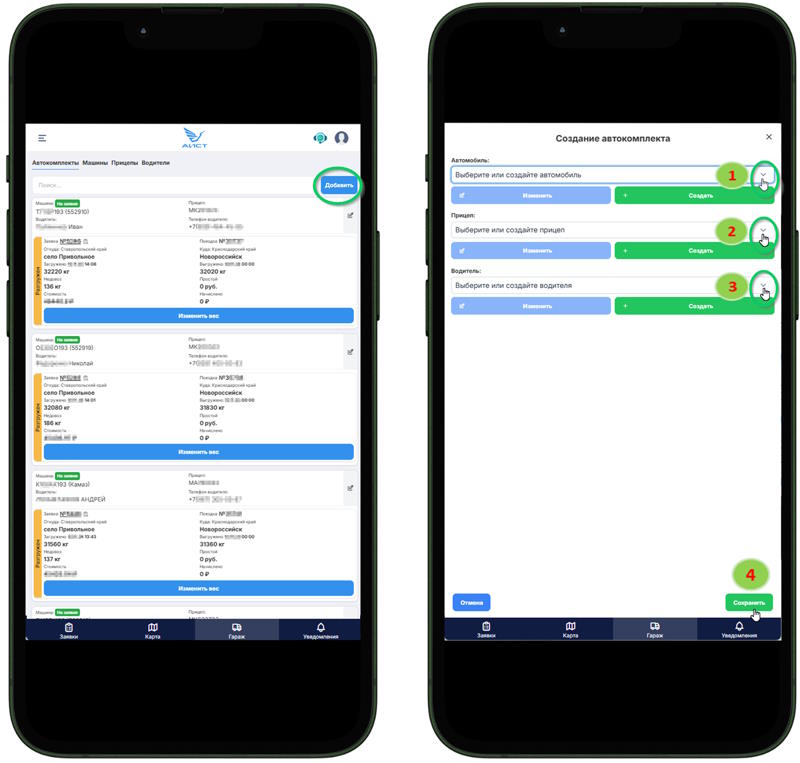 Обратите внимание доступно как формирование автокомплекта (заполнение данных будет последовательным авто - прицеп - водитель) сразу, так и добавления машины, прицепа и водителя отдельно с последующим объединением в автокомплект