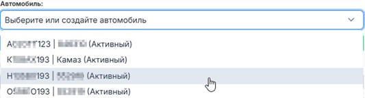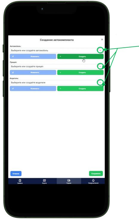 Сформировать автокомплект можно из ранее отдельно созданных авто, прицепа и водителя, путем выбора нужного из раскрывающегося списка
