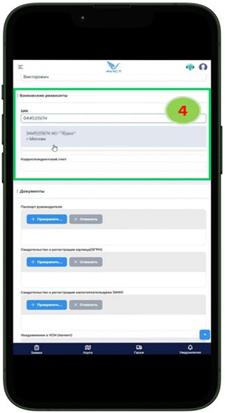 4. Внесите банковские реквизиты организации, для перечисления ДС за осуществленные перевозки. Начните заполнение с БИК обслуживающего банка, системой будет предложен банк на основании вводимых данных до окончательного внесения, при выборе наименование банка и корреспондентский счет будут заполнены автоматически. Останется внести только номер счета