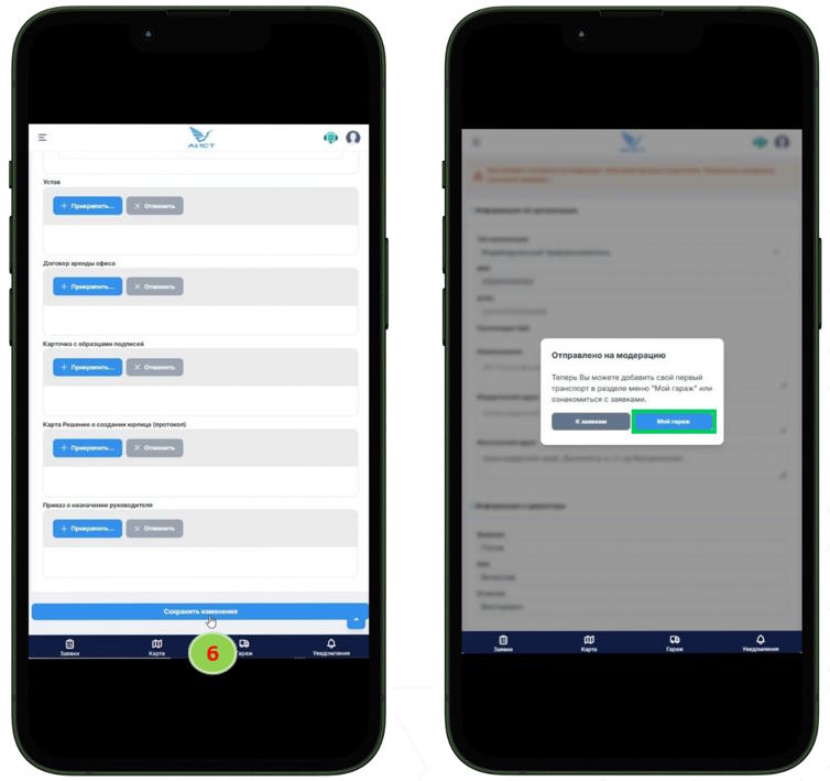 6. Сохраните изменения в нижней части формы, система сообщит о направлении на модерацию. Можно сразу приступить к регистрации вашего автотранспорта и водителей, выбрав «Мой гараж»