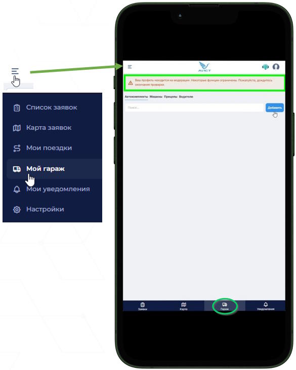 После направления на регистрацию организации (До момента завершения модерации в верхней части приложения будет отражаться информация об ограничении функциональности профиля) перейдите в раздел «Мой гараж»
